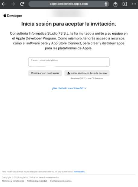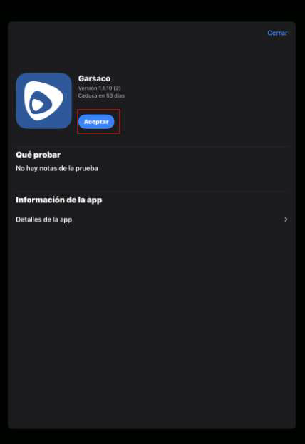 Cómo comentamos en el anterior apartado, al dar clic a "View in TestFlight" se nos abrirá la aplicación de "TestFlight" cómo aparece en la siguiente imagen, en la que tendremos que hacer clic a "Aceptar".