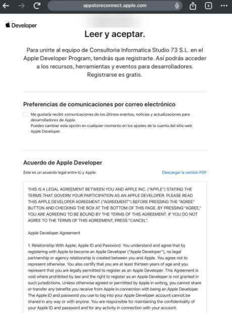 Tras haber iniciado sesión con las credenciales nos aparecerá la siguiente pestaña, en la que deberemos de aceptar los acuerdos.