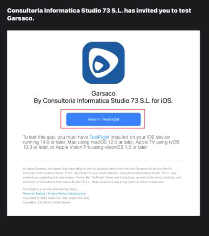 Por último, al realizar todos los anteriores pasos se tendrá que esperar a que llegue un nuevo correo electrónico con una nueva invitación, en la que tendremos que hacer clic a "View in TestFlight".